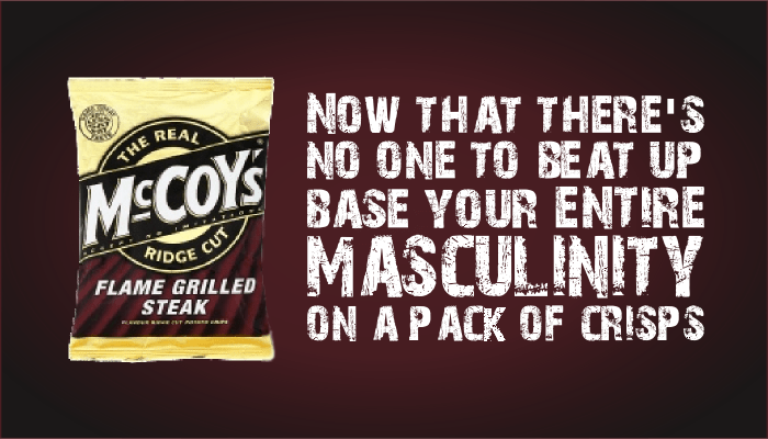 I wandered into the MCR last Saturday for a drink with some friends. Whilst at the bar, I noticed a few members of W1 eating a sharing-sized packet of McCoys. I was perturbed by the writing on the reverse side of the packet ‘MAN CRISPS’. I advised Ms Bullivant that she was eating misogynistic crisps; horrified, she stopped. I then sat down in the MCR proper thinking about how disturbing it is that in 2015 you can still gender food stuffs a la style Yorkie (‘Its not for Girls’). Yorkie discontinued this tagline in 2011, apparently. This is not the first time I have encountered this particular brand of McCoy’s crisps – indeed, less than two weeks ago a clergy friend of mine and I shared a packet and we voiced our joint objections to the macho-ness of the product.