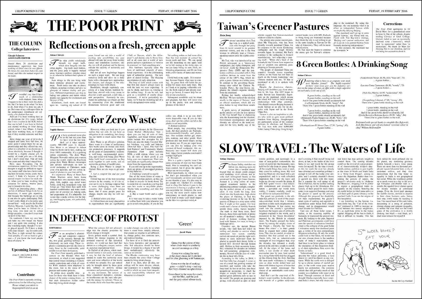 Issue #7 – Green 19 Feb 201625 Jan 2017 by The Poor Print A pdf of the print version of Issue #7 – Green – can be downloaded here: Issue #7 – Green Share this: Click to share on Facebook (Opens in new window) Facebook Click to share on X (Opens in new window) X Click to share on Reddit (Opens in new window) Reddit Click to share on Tumblr (Opens in new window) Tumblr Like Loading... The Poor Print Established in 2013, The Poor Print is the student-run newspaper of Oriel College, Oxford. New issues are published fortnightly during term, featuring creative contributions by members of the JCR, MCR, SCR and staff. Related Leave a comment Cancel reply Δ