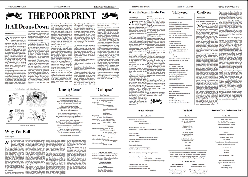 Issue #23 – Gravity 27 Oct 20175 Dec 2017 by The Poor Print A pdf of the print version of Issue #23 – Gravity – can be downloaded here: Issue #23 – Gravity Share this: Click to share on Facebook (Opens in new window) Facebook Click to share on X (Opens in new window) X Click to share on Reddit (Opens in new window) Reddit Click to share on Tumblr (Opens in new window) Tumblr Like Loading... The Poor Print Established in 2013, The Poor Print is the student-run newspaper of Oriel College, Oxford. New issues are published fortnightly during term, featuring creative contributions by members of the JCR, MCR, SCR and staff. Related Leave a comment Cancel reply Δ