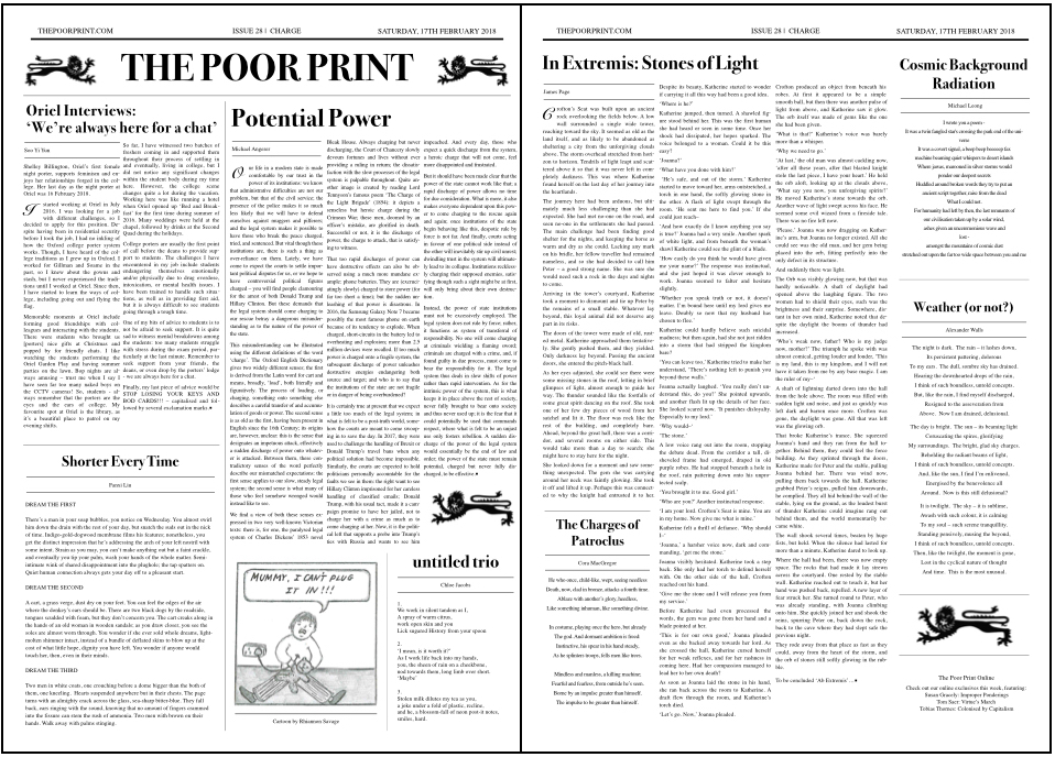 Issue #28 – Charge 27 Apr 201829 Apr 2018 by The Poor Print A pdf of the print version of Issue #28 – Charge – can be downloaded here: Issue #28 – Charge Share this: Click to share on Facebook (Opens in new window) Facebook Click to share on X (Opens in new window) X Click to share on Reddit (Opens in new window) Reddit Click to share on Tumblr (Opens in new window) Tumblr Like Loading... The Poor Print Established in 2013, The Poor Print is the student-run newspaper of Oriel College, Oxford. New issues are published fortnightly during term, featuring creative contributions by members of the JCR, MCR, SCR and staff. Related Leave a comment Cancel reply Δ
