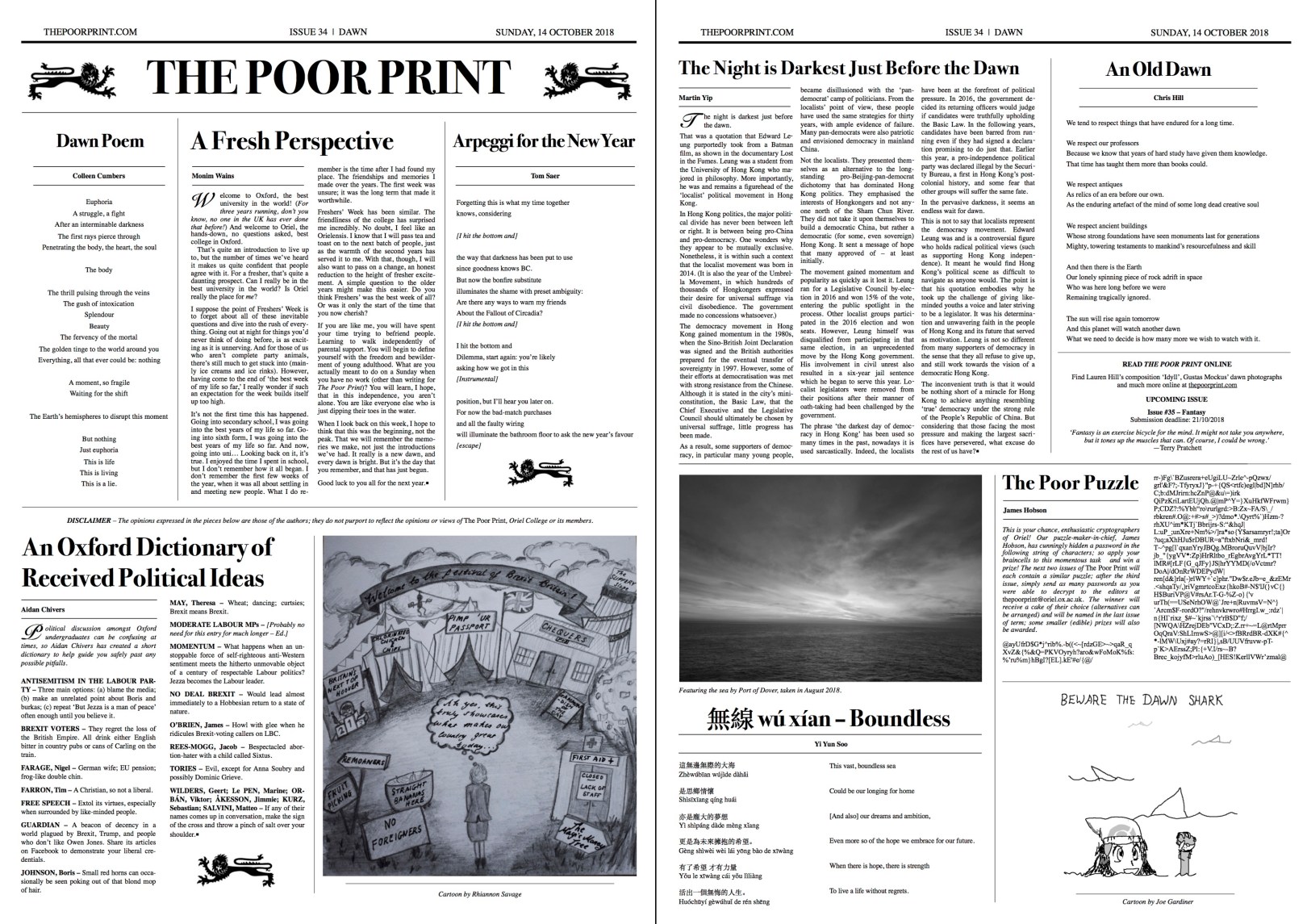 Issue #34 – Dawn 14 Oct 201820 Jan 2019 by The Poor Print A PDF of the print version of Issue #34 – Dawn – can be downloaded here. Share this: Click to share on Facebook (Opens in new window) Facebook Click to share on X (Opens in new window) X Click to share on Reddit (Opens in new window) Reddit Click to share on Tumblr (Opens in new window) Tumblr Like Loading... The Poor Print Established in 2013, The Poor Print is the student-run newspaper of Oriel College, Oxford. New issues are published fortnightly during term, featuring creative contributions by members of the JCR, MCR, SCR and staff. Related Leave a comment Cancel reply Δ