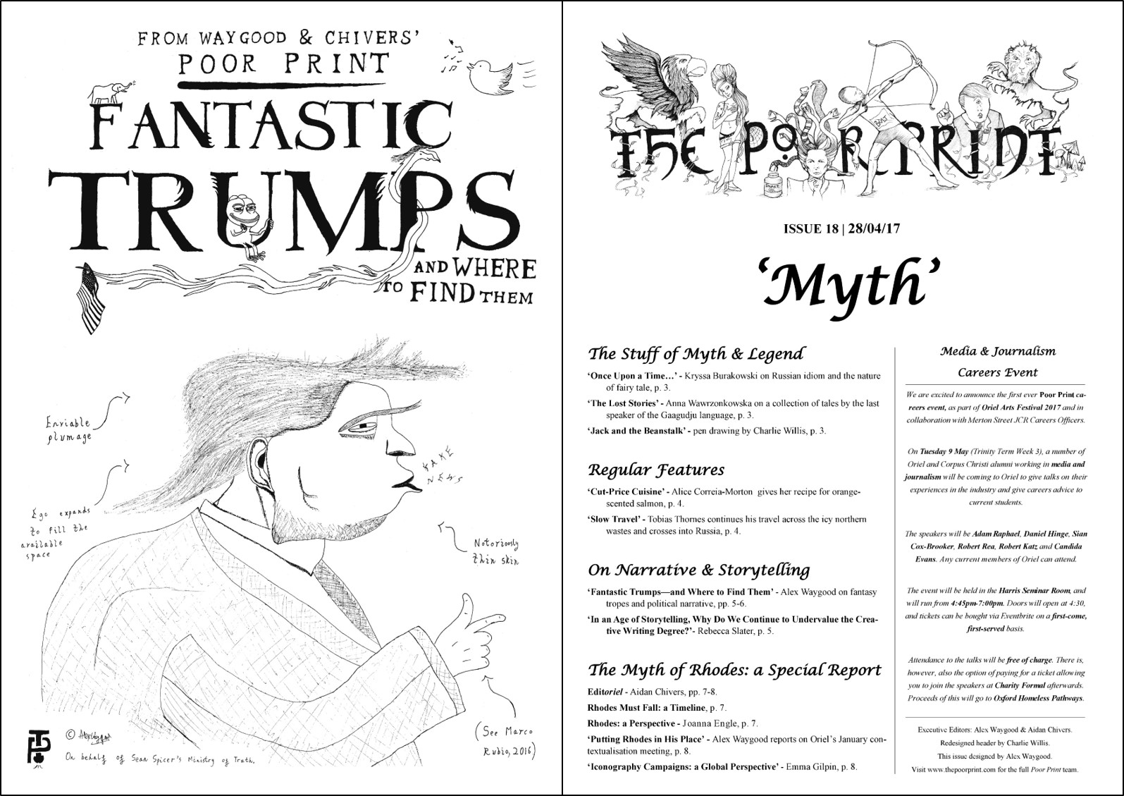 The Poor Print is now remarkably different to what it was before; maybe closer to the style of a newspaper than a magazine. Whatever you may call it, we hope that this evolution will continue on. You can still find old issues on the bottom floor of the library, as well as the archive section of the website. It is a part of Oriel of which we are proud.