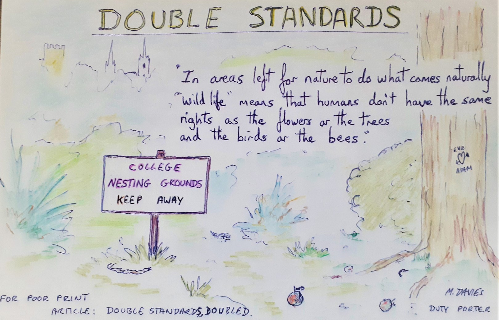 Their weekend walk got interrupted by a ‘Bulldog’. (The name given to the now disbanded bowler hatted University Police. A type of special constable with a warrant card and the powers of arrest within four miles of a university building. Regarding students, they largely acted under the authority of ‘loco parentis’ and were controlled by the Proctors’ office.) Having been called in by Christ Church, the Bulldogs had quick-footed it through from St Aldates and onto the meadow. College staff then guided and directed them to a secluded area of high grass with low bushes which a bird watcher had kept under discrete distanced observation.