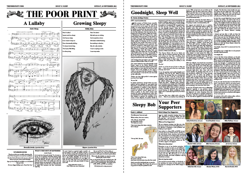 Issue #72 – Sleep 28 Nov 202128 Nov 2021 by The Poor Print A PDF of the print version of Issue #72 – Sleep – can be downloaded here. Share this: Click to share on Facebook (Opens in new window) Facebook Click to share on X (Opens in new window) X Click to share on Reddit (Opens in new window) Reddit Click to share on Tumblr (Opens in new window) Tumblr Like Loading... The Poor Print Established in 2013, The Poor Print is the student-run newspaper of Oriel College, Oxford. New issues are published fortnightly during term, featuring creative contributions by members of the JCR, MCR, SCR and staff. Related Leave a comment Cancel reply Δ