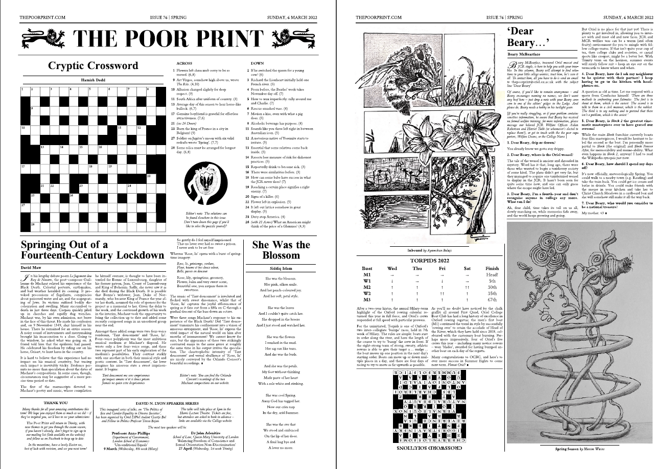 Issue #76 – Spring 6 Mar 20226 Mar 2022 by The Poor Print A PDF of the print version of Issue #76 – Spring – can be downloaded here. Share this: Click to share on Facebook (Opens in new window) Facebook Click to share on X (Opens in new window) X Click to share on Reddit (Opens in new window) Reddit Click to share on Tumblr (Opens in new window) Tumblr Like Loading... The Poor Print Established in 2013, The Poor Print is the student-run newspaper of Oriel College, Oxford. New issues are published fortnightly during term, featuring creative contributions by members of the JCR, MCR, SCR and staff. Related Leave a comment Cancel reply Δ