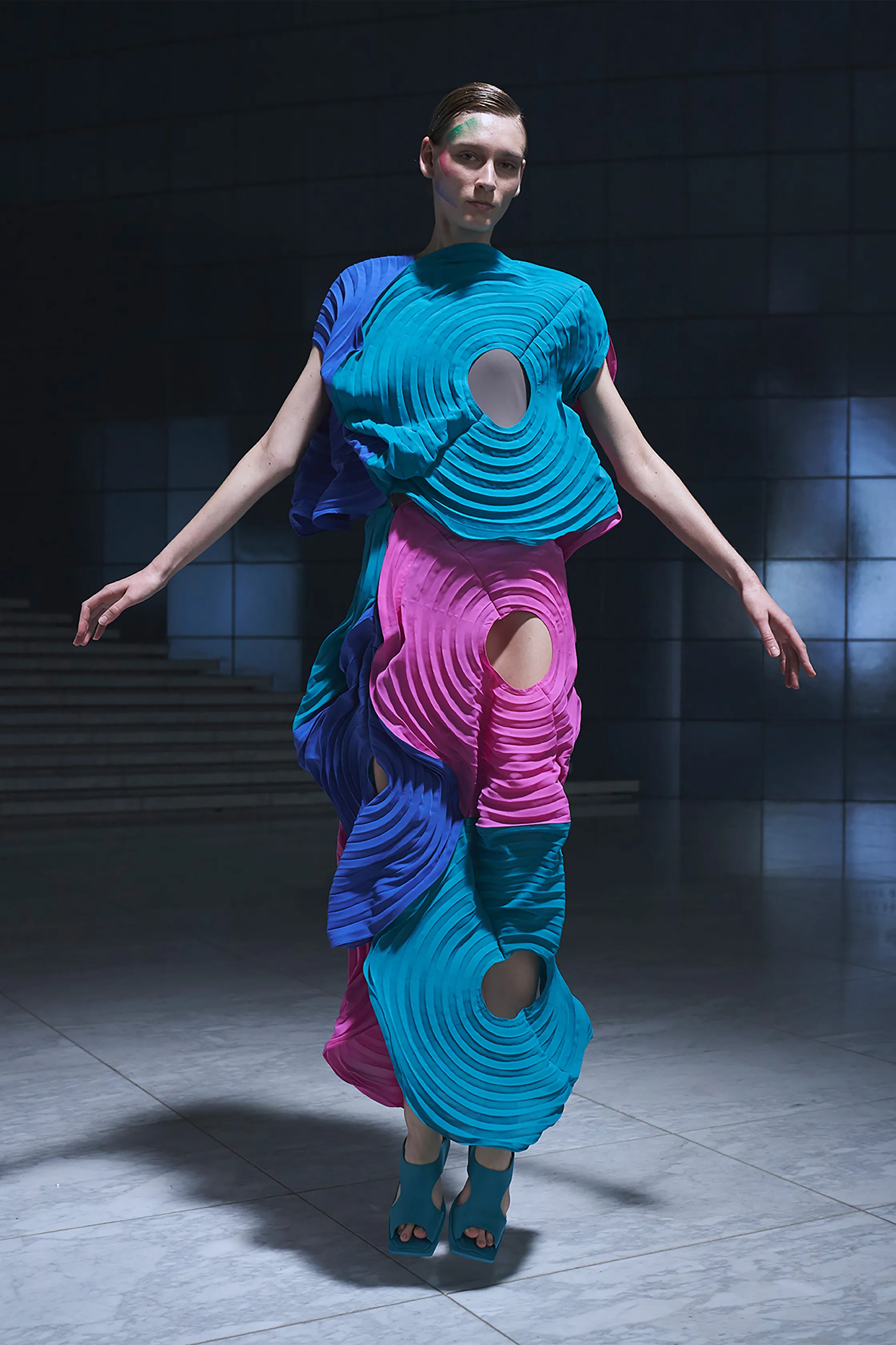 Miyake framed this collection around a physical descent – into the deep-sea ‘stages’ of feeling and emotion. This was first seen with looks depicting the tranquillity and peace felt in the water. Light beams dancing through the shallow space guiding the way downwards. He explored the silence of this entry, sinking into the abyss with nothing but the noise in your own mind. Issey is known for his mastery of fabric manipulation creating infinite pleats that contour and warp. In this collection, he plays with prints and the traditional freehand dyeing technique hikizome. The subsequent series depicts ‘carved’ garments that are fluid with cutouts, a swimming series that have garments constructed with shapes created by waves and sea creatures. At every point intentional conceptual design was implemented by Miyake – brought to life by the videographic direction of Kodama.
