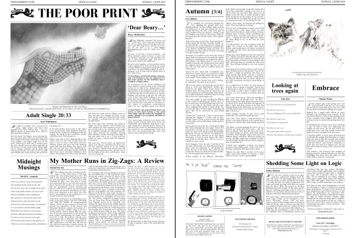 by Peter Gent Four years ago when we launched the print edition of The Poor Print, the editorial team, then led by Jacob Warn, had an idea: we would publish anything anyone submitted. But, we said, we would only do so if we could shape submissions with a strong editorial hand. We wanted concise, pithy, […]